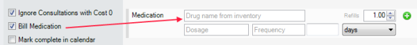 10. Bill Medication - when checked, the program will generate billable items for the entered medication. This is typical for clinics or hospitals who dispense drugs through the in house pharmacy. Also when checked the