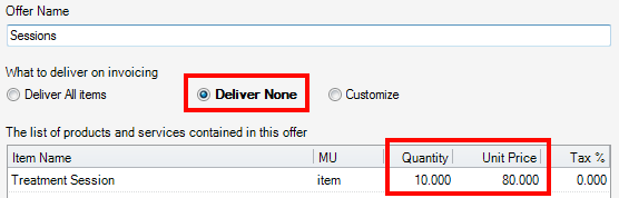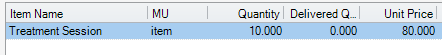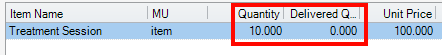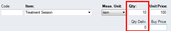 In the Delivered Qty enter the quantity which the patient received so far. For example, if this is prepayment for 10 sessions in the next month, enter as bellow: