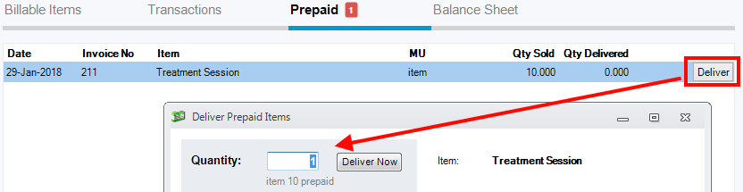 After you complete a session with the patient, to deliver a prepaid item, simply click Deliver as bellow