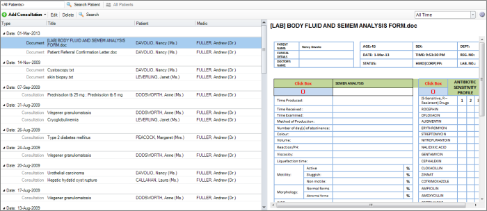 Medical Activities viewer provides a reverse chronological view of all entered medical records - consultations, diagnoses, treatments, prescriptions, findings and so on.