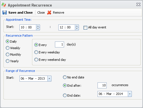7. Click Save and Close to close Appointment Recurrence box