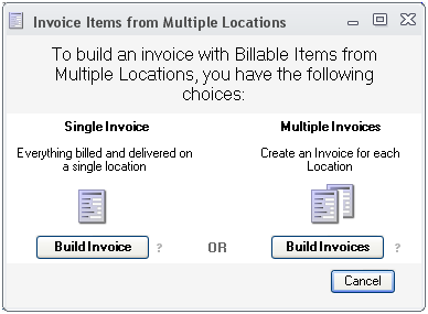 When you have billable items from multiple locations and you try to invoice them, you will be prompted by the window bellow.
