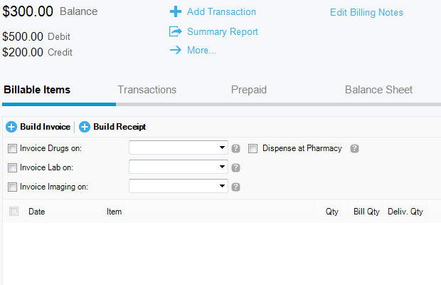 The Billing section of the Patient Chart displays the financial summary or the patient, registered financial documents like invoices and receipts, and the Billable Items and Prepaid Items.