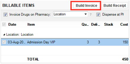 From Patient Chart -> Billing -> Billable Items press the Build Invoice or Build Receipt as for treatments or drugs:
