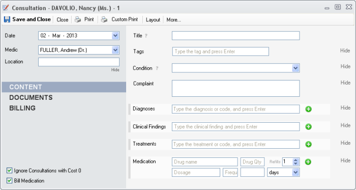 6. Medication - the list of prescribed drugs. The boxes will hint values from the Drugs Categories when Bill Medication is not checked, and from Items when is checked