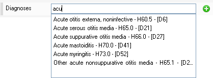 4.1. To enter a new diagnosis to the list, type the name or the code of the diagnosis.If you type part of the name or code, the program will give you hints in a drop down for what you type. You can select one of the hints or press Enter to commit the diagnosis
