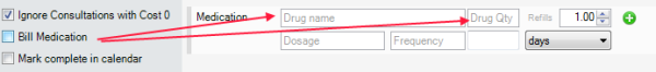 10. Bill Medication - when checked, the program will generate billable items for the entered medication. This is typical for clinics or hospitals who dispense drugs through the in house pharmacy. Also when checked the