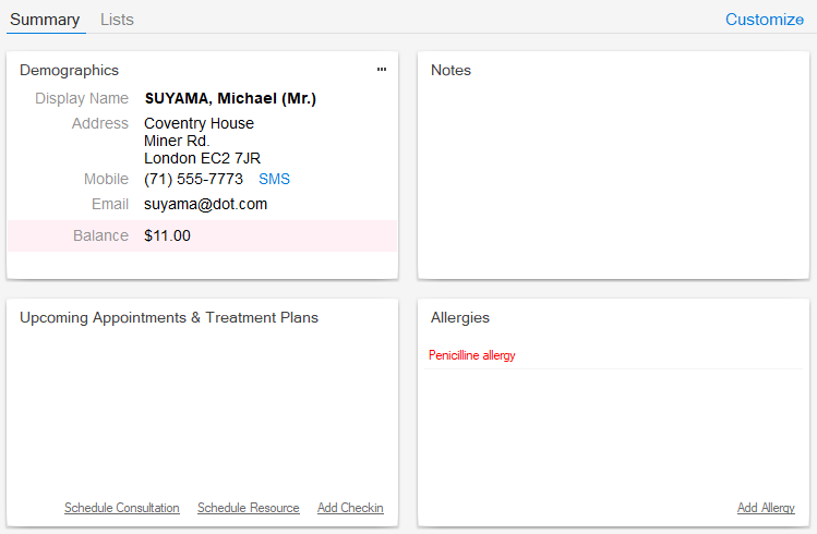 The Dashboard in Patient Chart provides a dashboard with demographics, notes and some patient records.