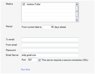 3. Next check which medics calendars you want to send here, the destination email, and the email credentials with which you want to sent the email. If you send to a medic, check only one medic and enter his email address under TO.
