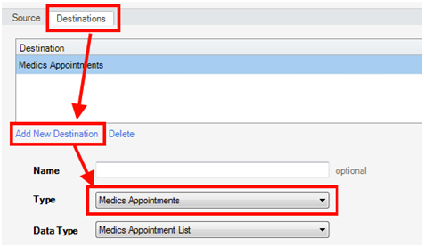 2. In the opened window, select Destinations tab. Next press Add New Destination and select the type as Medic Appointments as bellow: