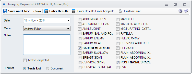 5.1. Format - Tests List - you can request test from using a list of check boxes as above, whose items can be billable automatically. More at Tests Setup