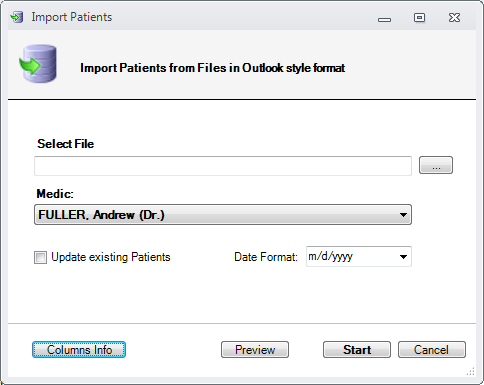 Here you will be able to import a list of patients from a CSV file. The file must be formatted (have the CSV header) in an MS Outlook style