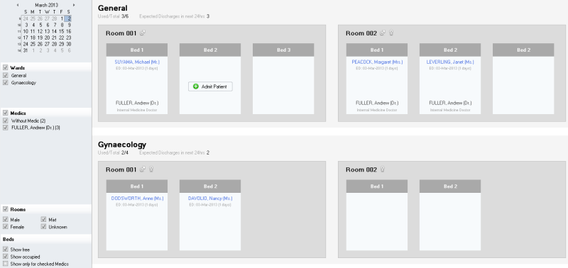 1. Filter the Inpatients - use the left sidebar to filter the rooms and beds in the right panel. You can filter by date, ward, medics, room type or bed occupancy