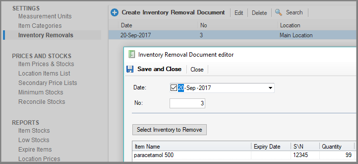 The Inventory Removal Documents allows the removal of inventory, typically expired drugs or items