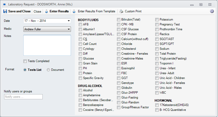 5.1. Format - Tests List - you can request test from using a list of check boxes as above, whose items can be billable automatically. More at Tests Setup