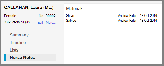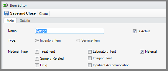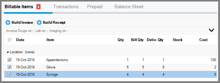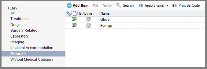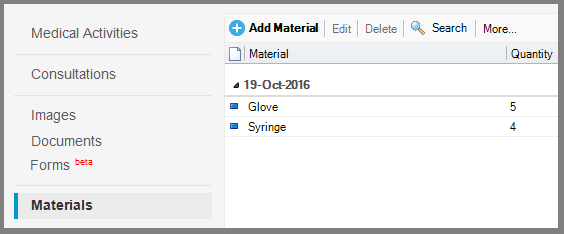 The medics or staff can enter into the system the used materials, like syringes, gloves or other. Later these can be billed from the Billable Items, in the same manner as the other billable item types