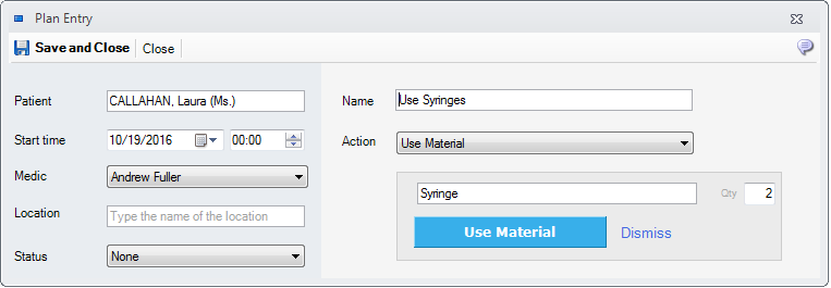 Next when the plan template is used on a patient, the nurse or staff member will only have to press the Use Material button as bellow: