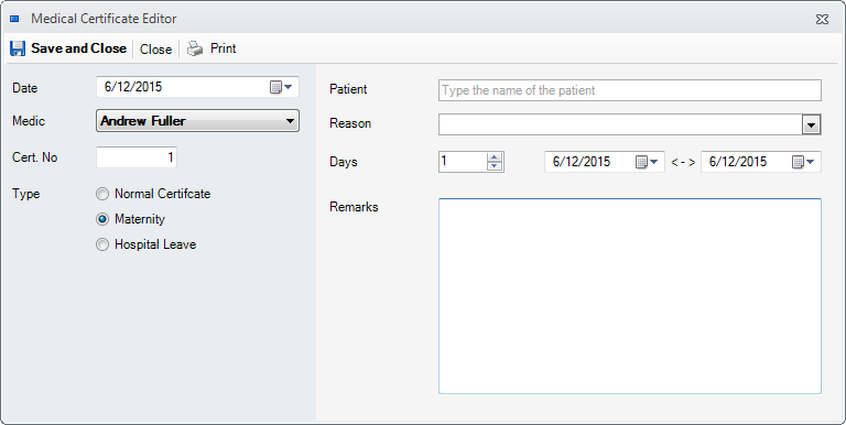The medical certificates will be issued by the medic to certify that e. g. Patient is unfit for work for a number of days, or whatever other activities if stated. This medical certificate is then given by the patient to his/her relevant authority, typically employer. You can use the default printing template, or customize it to fit you needs.