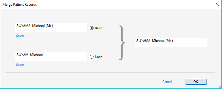 Here you will be able to select the two patients you want to merge, and specify which of them to keep, by checking the Keep check box near the patient name