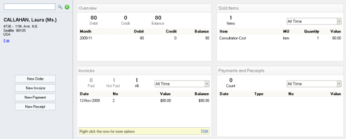 1.3. Allows the entering or a new Invoice, Payment or Receipt for this patient