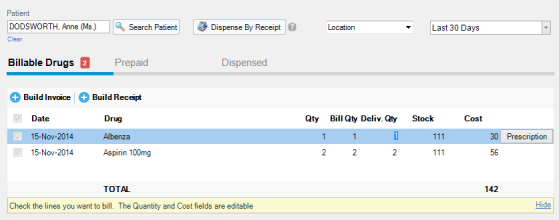 1. You can bill one or more drugs, by checking the ones you want to bill. You can modify the Quantity, Delivered Quantity and Cost in the grid. Next click Build Invoice or Build Receipt in the panel.