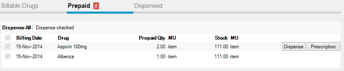 To dispense all the prepaid drugs, click the Dispense All button. To dispense some rows in the grid, check those rows and click the Dispense checked only link