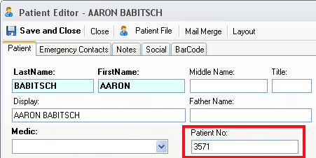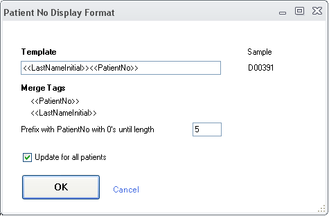 In the opened window configure the format of the Patient No with the merge fields <<LastNameInitial>> and <<PatientNo>>, as in the example bellow: