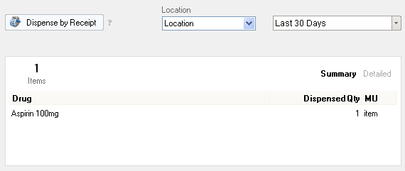 It displays all the dispensed drugs that satisfy the Location and date range filter