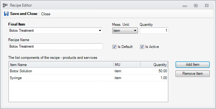 The Recipe Editor editor is used to create a new recipe or edit an existing one. The following is an example of creating the recipe for the Botox Treatment service, that consumes typically 50 units of Botox Solution and one Syringe.