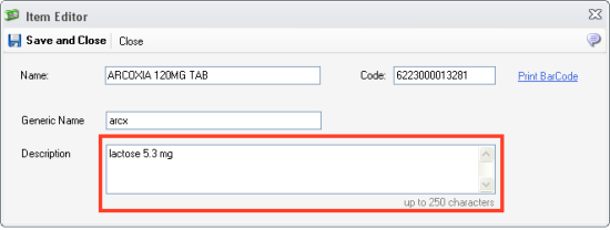 Item Description and Drug Prescription Notes
