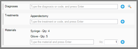 The medics or staff can enter into the system the used materials, like syringes, gloves or other. Later these can be billed from the Billable Items, in the same manner as the other billable item types