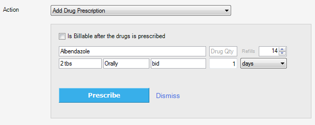 The responsible user will only have to complete the action of the entry, for example bellow to click on the Prescribe button: